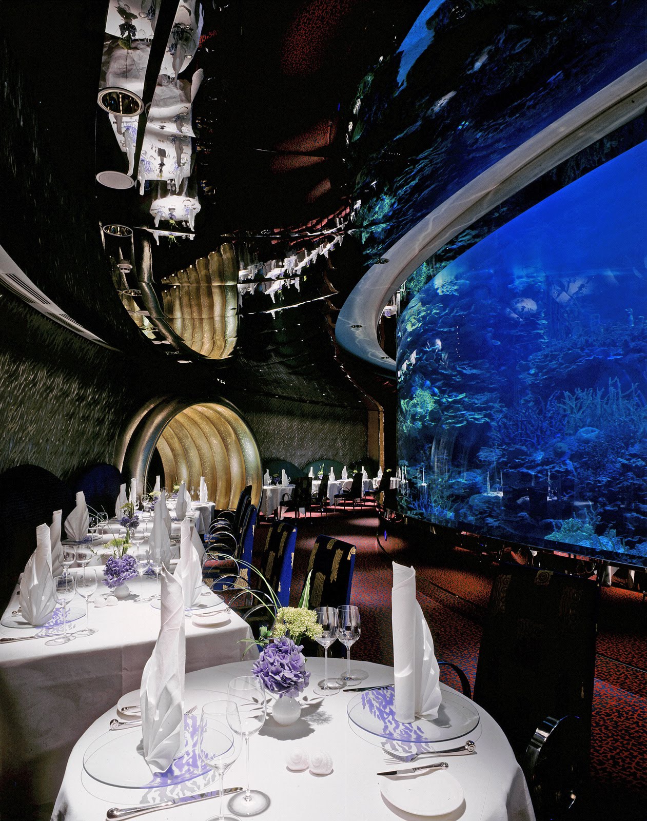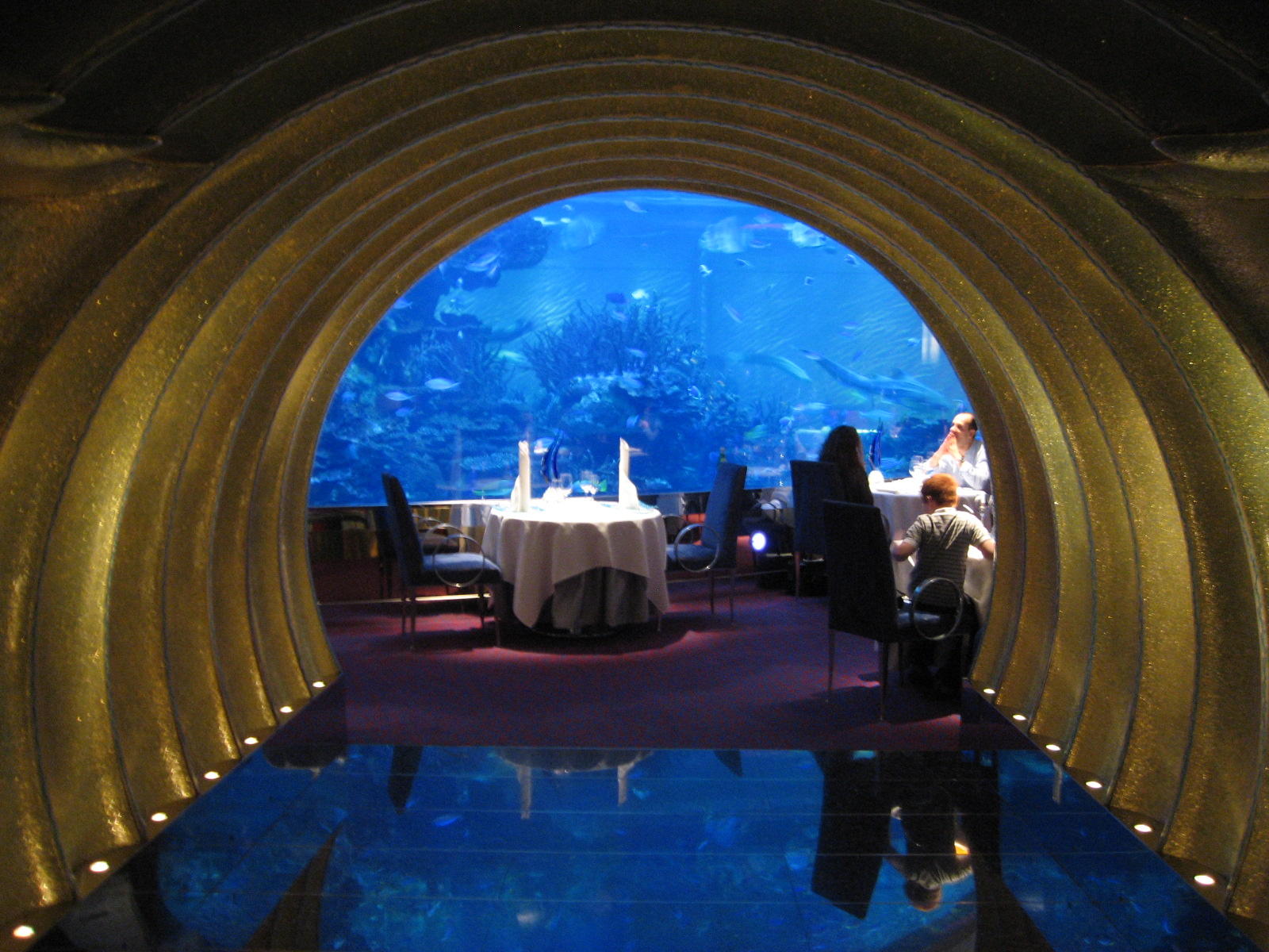 The dining experience at the Burj Al Arab’s signature restaurant ‘Al Mahara’ is unique. This underwater themed restaurant begins with a mock submarine ride from the reception to the dining area. The tables are situated around a giant glass aquarium full of fish that adds to the restaurants submerged theme.